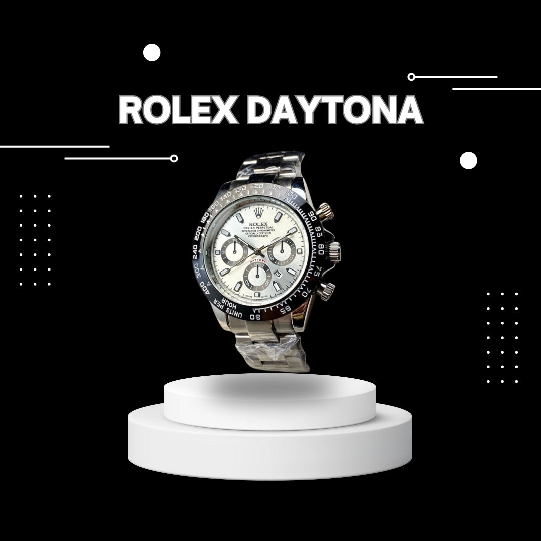 Experience refined craftsmanship with the Rolex Daytona Rotating Bezel Quartz Watch, designed for precision and style. Featuring a reliable battery-powered quartz chronograph movement, it offers accurate timekeeping alongside a convenient day and date display. The silver stainless steel strap combines durability with comfort, while the scratch-resistant crystal maintains clear visibility. Packaged in a premium box with a master lock, this watch is ideal for discerning individuals seeking both functionality and elegance.