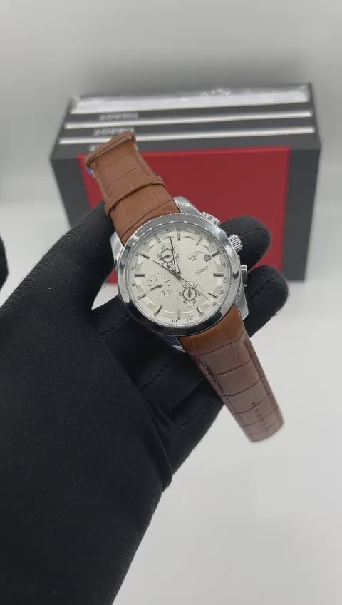 This A-Class Replica Tissot Chronograph Tachymeter watch combines refined elegance with functional precision. Featuring a polished stainless steel case, a crisp white dial, and a luxurious brown leather strap, this timepiece is designed to impress. Equipped with chronograph sub-dials, a tachymeter scale, and a date display, it offers practical functionality for everyday use. The classic design and high-quality materials make this watch a versatile accessory that pairs well with both formal and casual attire.